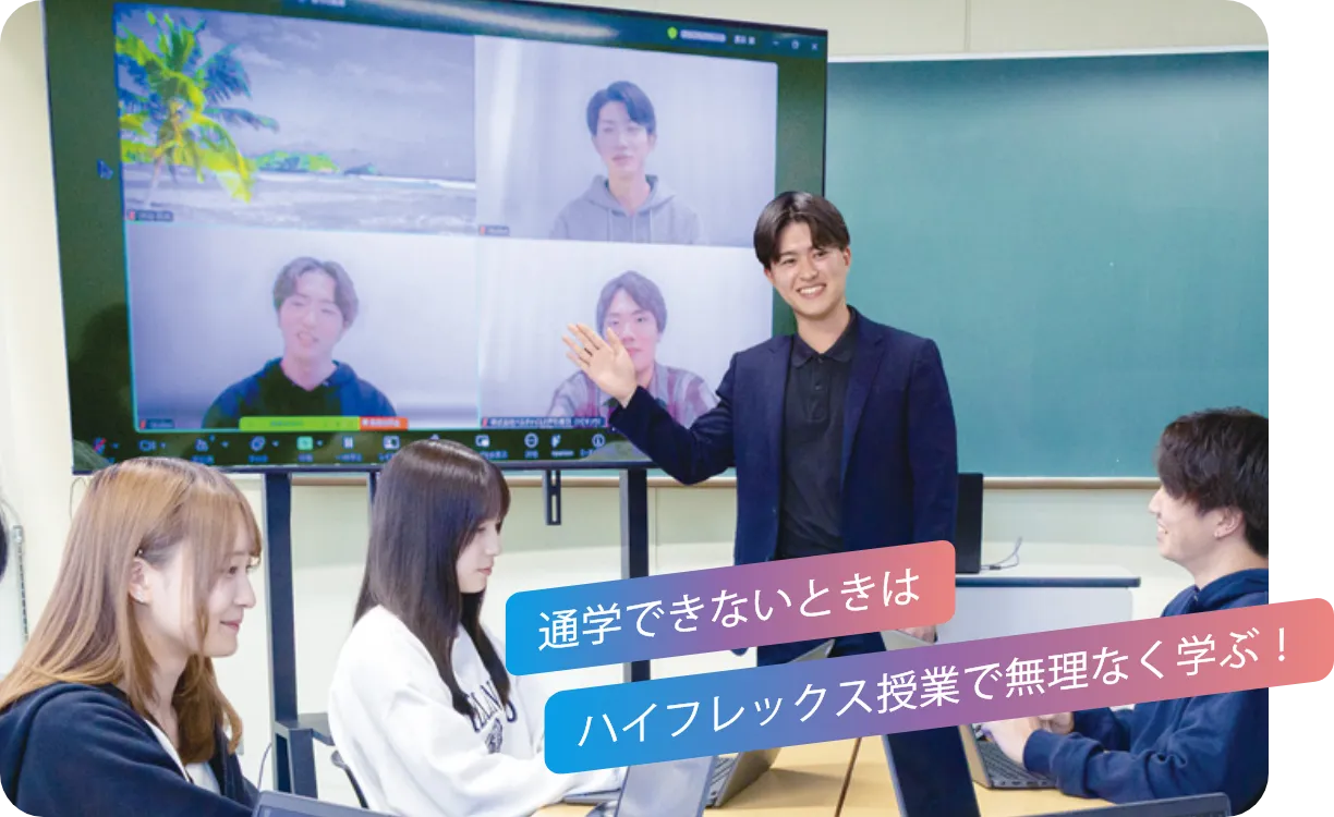 ハイフレックス授業なら、通学できない(悪天候や体調がすぐれない)場合でも大丈夫!学校に通える日も、通えない日も柔軟な学習スタイルで、安心して学べるスタイルです。